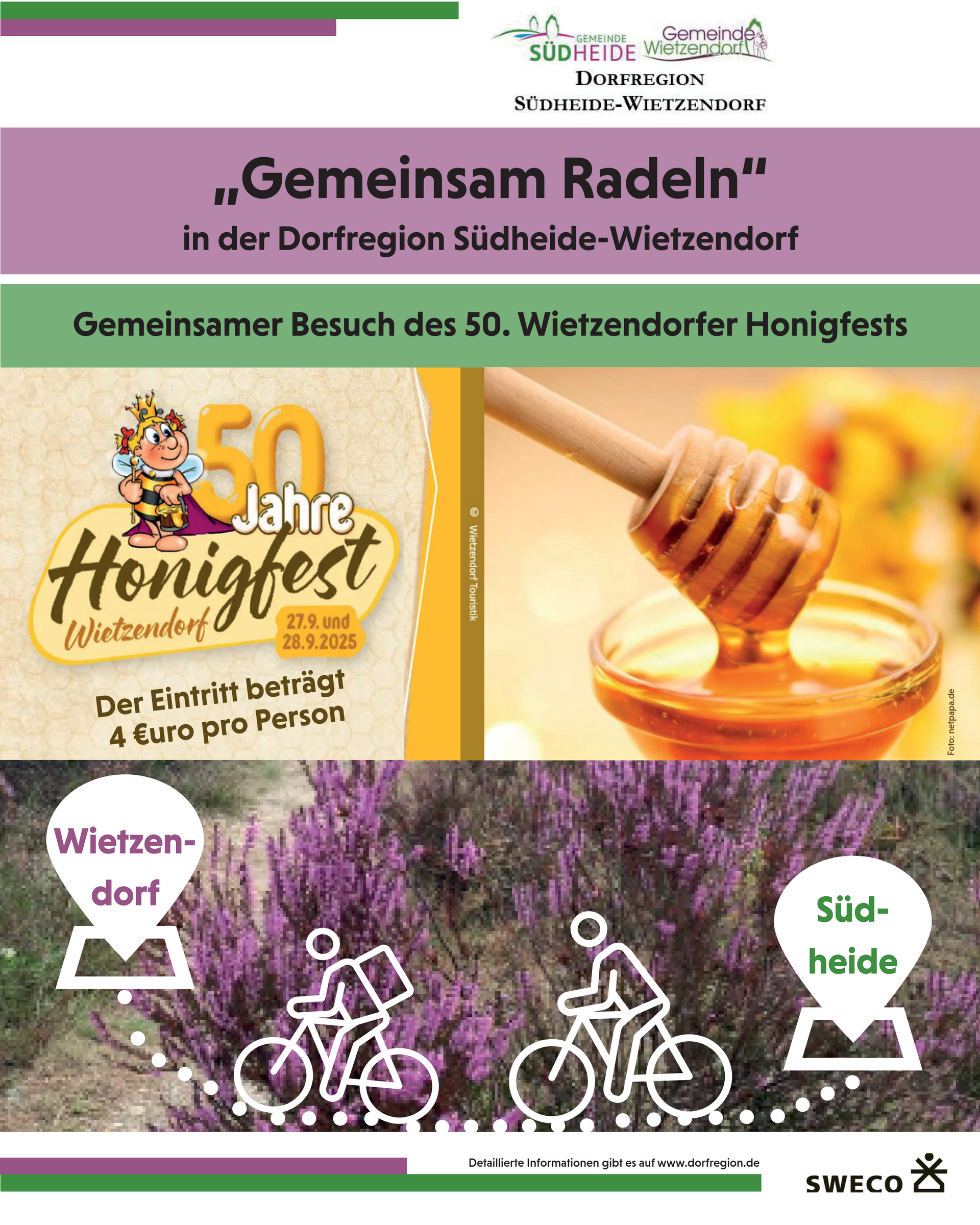In diesem Jahr findet wieder eine gemeinsame Radtour durch die Dorfregion statt. Diesmal wird Wietzendorf bei ihrem Jubiläums-Honigfest besucht. Die Fahrt beginnt um 11:00 Uhr in Lutterloh und führt über Baven nach Wietzendorf. Treffpunkt in Baven ist um 11:45 Uhr. Die gemeinsame Rückfahrt ist für 16:00 Uhr geplant.